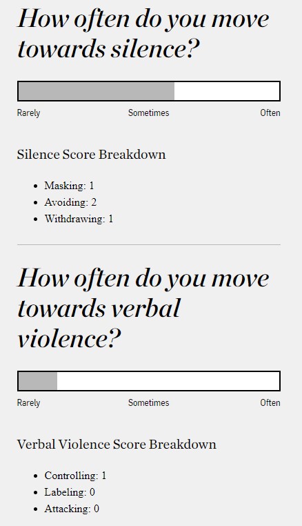 I found these results and the examples from Crucial Conversations very revealing. I know I avoid and withdraw when conflict or disagreement arises, but I would never have self-assessed “controlling” in the violence category.