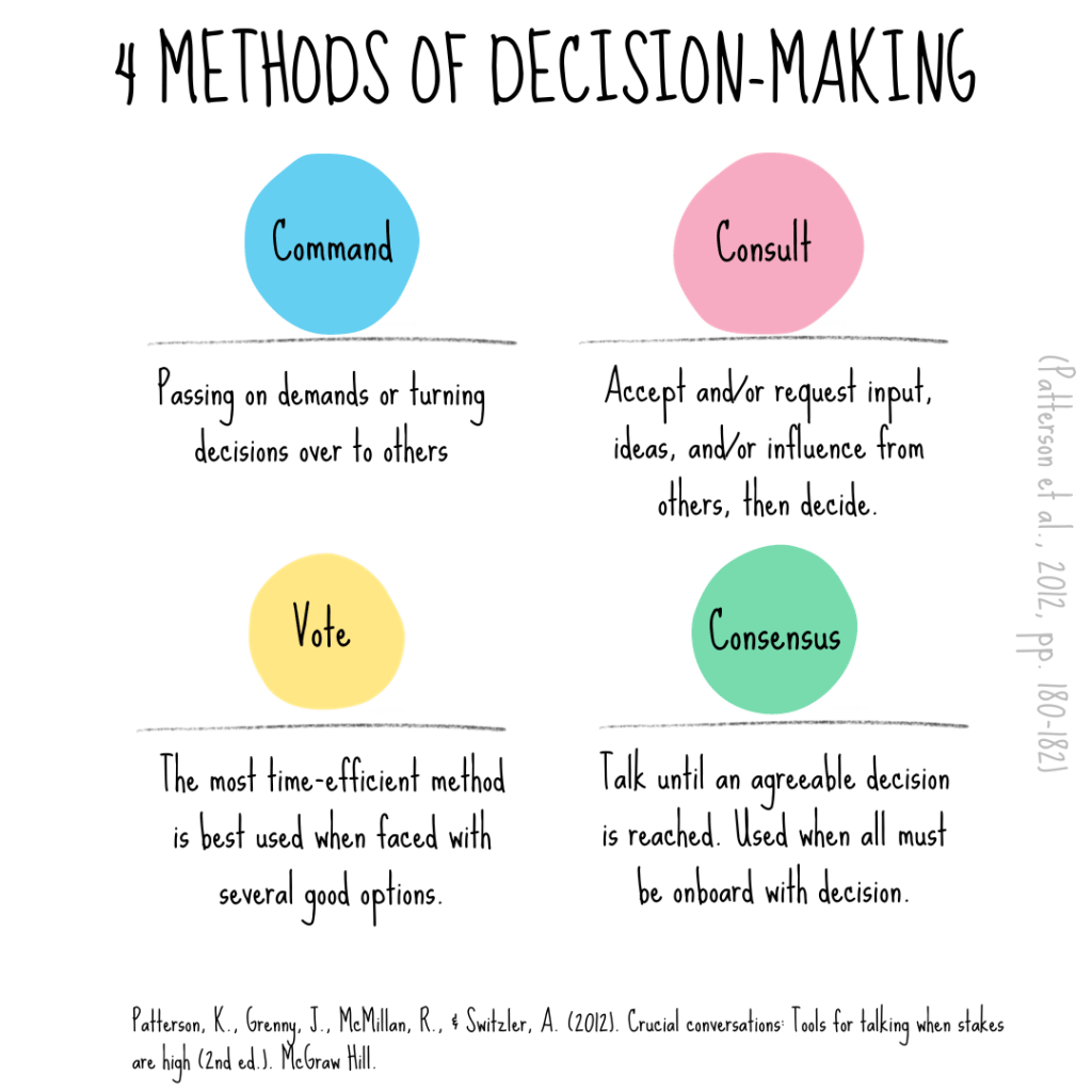 “To avoid violated expectations, separate dialogue from decision making. Make it clear how the decision will be made – who will be involved and why” (Patterson et al., 2012, p. 179) before starting a dialogue. When the line of authority is clear, the manager will be the decision maker. When the line of authority is unclear, identifying the decision-maker can be more challenging because a dialogue will be needed to identify who will decide collectively.