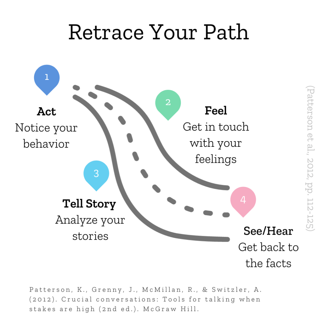Suppose we work to sincerely and patiently listen to another’s experience. In that case, we can openly and curiously explore how others are feeling, what they are thinking, and how we can help restore safety so that dialogue can continue (Patterson et al., 2012, p. 157). Just as we have done in our preparation for crucial conversations, we can encourage others to follow the five steps outlined above to retrace them together to develop our crucial conversation skills.