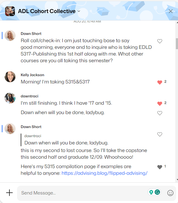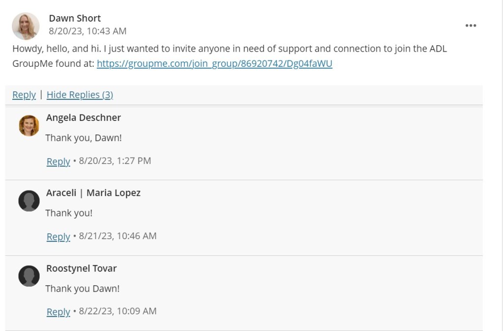 Several semesters ago, I began sharing a GroupMe for a collective of ADL learners. I had high hopes that the group would continue to intake new ADL students, thereby creating a long-term mentorship group with veteran and graduate ADL students continuing to learn while giving guidance and perspective to future cohorts. The hope was that learners who struggled to connect with a community in their coursework would find additional opportunities to connect with others with similar innovations or interests.