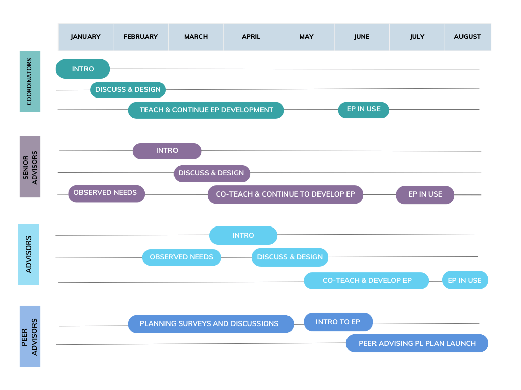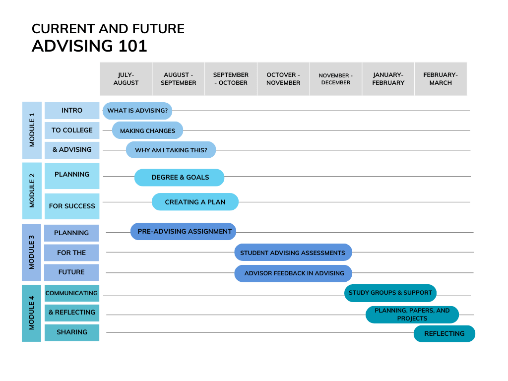 Future phases of the advising innovation add courses like Advising 101 that continue to supplement learners’ learning stages and scaffold their ever-increasing responsibilities.