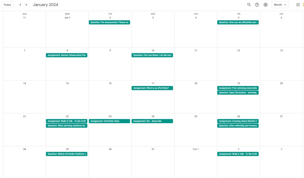First, the Associate Director will guide advising coordinators through the professional learning plan. As advising coordinators learn about ePortfolios and develop theirs, they will consider how to introduce Senior Advisors to Professional Learning and ePortfolios. While facilitating the Senior Advisors’ Professional Learning, the Coordinators will simultaneously co-learn while continually developing and expanding their ePortfolio. When the Senior Advisors begin teaching the Advising team about ePortfolios, the Advising Coordinators and Senior Advisors will continue to grow their ePortfolio practice while co-learning and supporting one another at each level. This iterative process allows for collaboration as team members mentor and support one another throughout the learning process. As advisors at every level grapple with the challenges of learning new skills, they will experience those frustrations together while also brainstorming for solutions to the challenges that change inevitability brings.