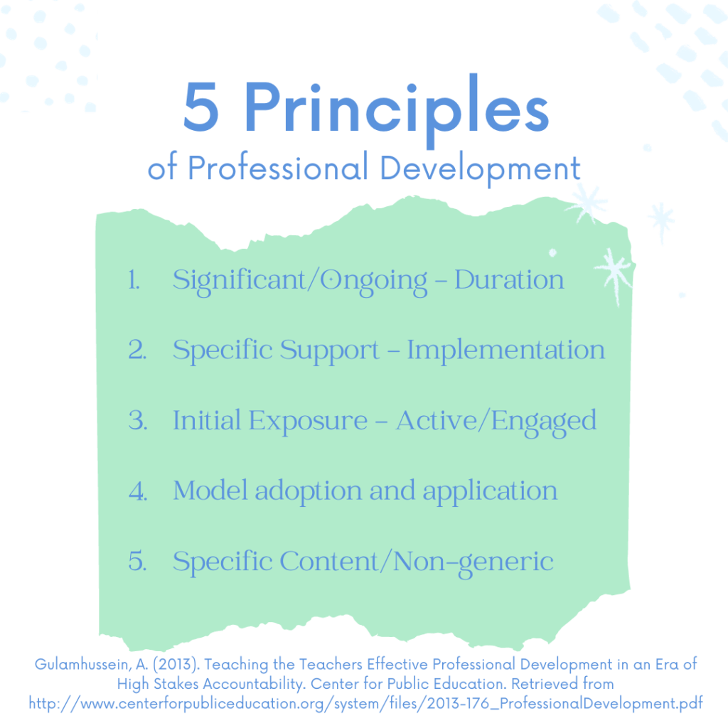 Gulamhussein, A. (2013). Teaching the teachers: Effective professional development in the era of high stakes accountability.