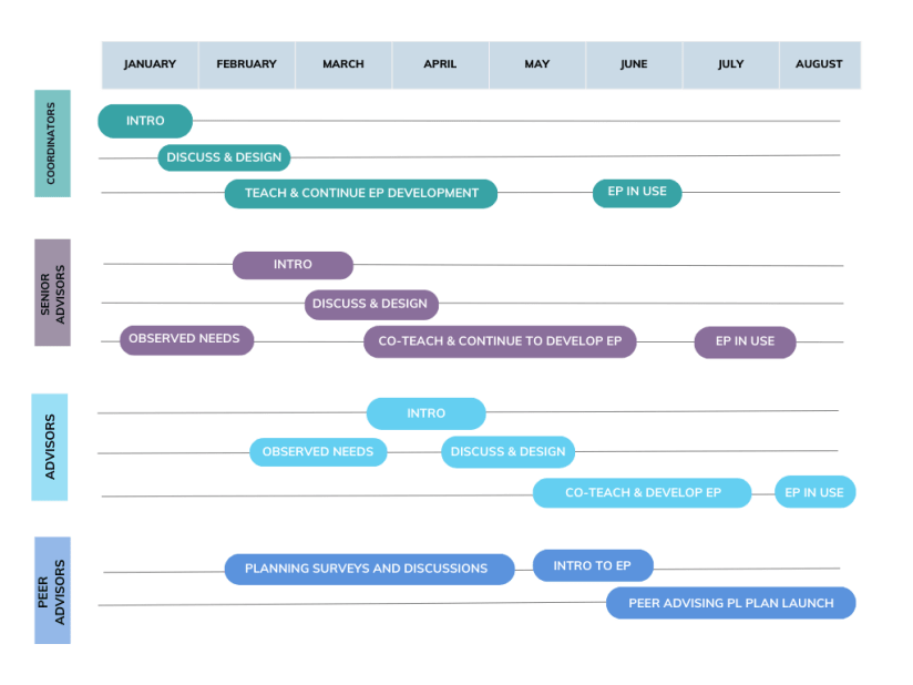 - Phase 3: Estimated Delivery Time – 10 hours, 30 minutes formalized Professional Learning with anticipated additions and adjustments to be made by Advising Coordinators and Senior Advisors as they make implementation adjustments—similarly limitless ongoing self-directed learning opportunities.