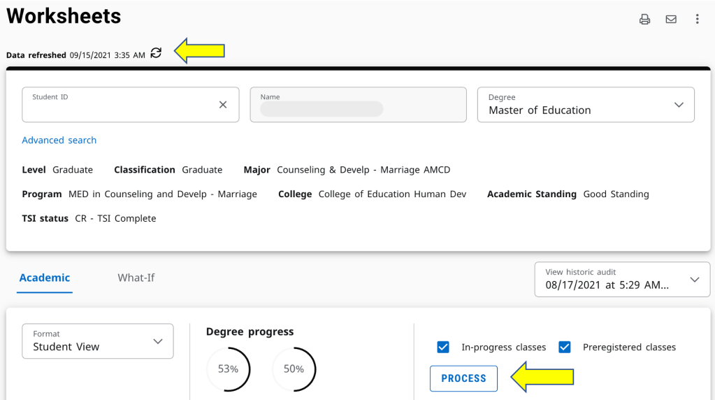 As the semester comes to an end and instructors begin submitting their final grades, you can click refresh and process new (indicated by the arrows below) to update the audit to the most current information available.