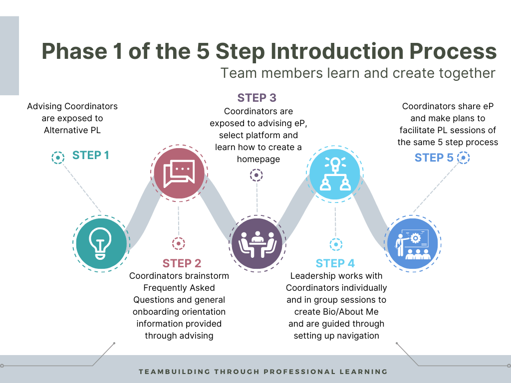 This first unit will help facilitate team building through professional learning opportunities. Various sessions introduce advising teams to Professional Learning, ePortfolios, and web design skills as an innovative solution to support advisors and students. Through various active introductions to content, learners will continually develop their knowledge while co-leading the Introduction to Professional Learning: ePortfolios for another cohort. This active co-learning and co-leading provide embedded support and collaboration over an extended period.