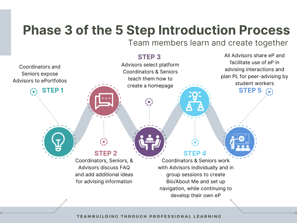 - Advisors, Senior Advisors, and Advising Coordinators plan workshops and activities to allow peer advisors to experience professional learning through the ePortfolio resources created by individual advisors/advising teams.