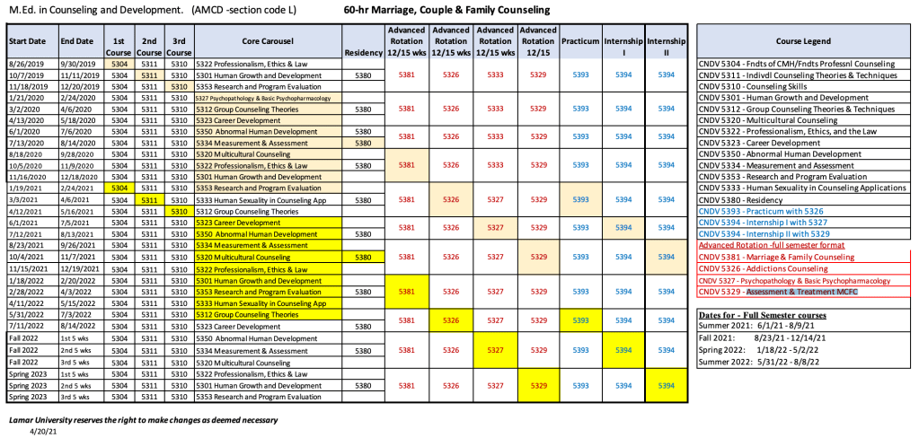 Once the first three foundational course are successfully completed with the B or better grade requirement, students once again move over one column and down one row to the “core carousel” column. Unlike the first three courses, students continue down this column until all of the listed classes are successfully completed (notice they begin to repeat). Students need to ensure that they do not miss any of these five-week courses as it can be many semesters before they are offered again. Students are allowed up to two C grades in the course of the MCFC program’s completion, provided that students maintain a 3.0 or higher GPA. Student who have earned three or more C grades should contact the enrollment office to plan for repeating coursework in order to maintain graduation eligibility.